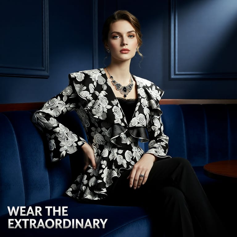 The Barcelona Jacket is a versatile statement piece that will transform your wardrobe. This jacket combines dramatic ruffles and a deep V-neckline, making it the perfect piece to layer over your favorite top or dress. Made from a beautiful White Roses sweater knit, its high-low hem and back belt detail give it a unique, tailored finish. Whether you're heading out for an evening or just running errands, this jacket pairs effortlessly with everything from jeans to slacks.
